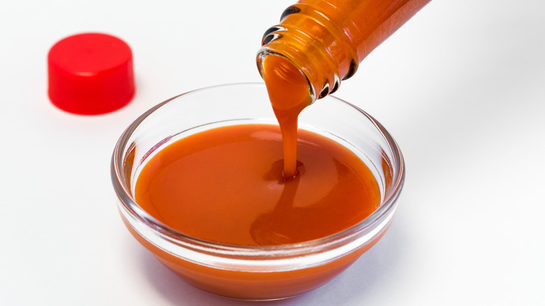 Hot sauce is easy to find but search for one that has a little extra sugar for this tip. Most bottles have chili peppers, vinegar, and various seasonings on the label, but the added sugars will take this a step further. When you add hot sauce to frozen fish sticks before cooking, it infuses the fish with the flavors of the spice and makes them more enjoyable. Using a large bowl and a mixing spoon, pour a hearty serving of sauce over the fish sticks and evenly coat them. Don't forget to spray the pan, whether it's in the oven or air fryer, with cooking spray to prevent sticking. Once the heat begins to melt the added sugars, the hot sauce will start to caramelize, much like chicken wings. You'll be left with a scrumptious, sticky treat that goes great with bleu cheese dressing, celery, and a side of ranch. You can even try it with some homemade hot sauce.