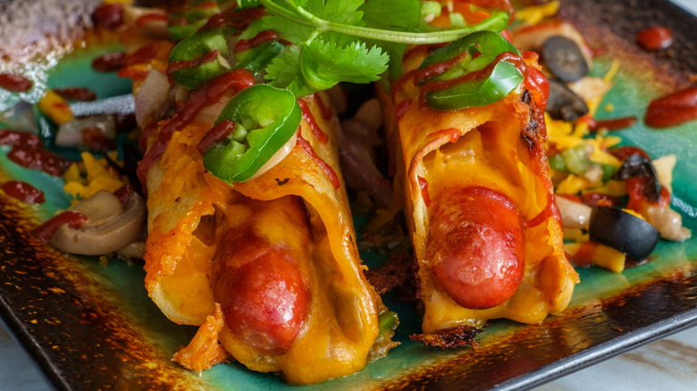 It's worth pointing out that all of these recipes call for flour tortillas. This raises the question — would these recipes work just as well with corn tortillas? WebMD notes that corn tortillas are generally much healthier than flour, packing on average about half the calories, are made from whole grain, and are gluten-free. Corn tortillas also tend to be around 5 to 6 inches in diameter, making them the perfect length for your typical hot dog.