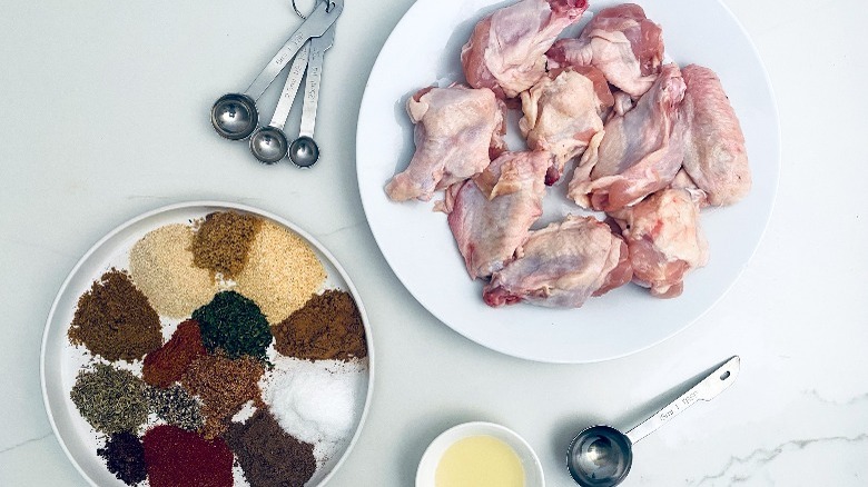 To make these air-fryer jerk chicken wings, you can start by gathering your ingredients. For this recipe, you will need salt, garlic powder, onion powder, paprika, cumin, thyme, dried parsley, cinnamon, allspice, nutmeg, pepper, cayenne, ground cloves, brown sugar, avocado oil, and chicken wings, halved at the joints.