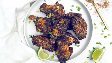 These ultra-crispy air fryer chicken wings feature a subtly spicy Jerk seasoning.
