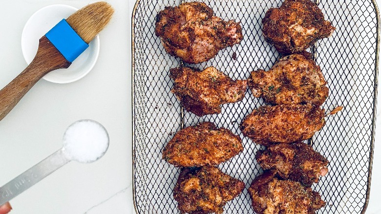 - Brush 1 teaspoon of avocado oil on the air-fryer rack or basket. Then place the wings in a single layer on the rack.