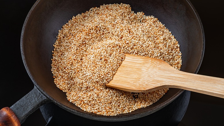 Sesame seeds offer extra flavor to plenty of dishes, and when they're toasted, it brings a nuttiness and added crunchiness to every bite, elevating what could be an otherwise bland dish. While you can purchase a bottle of toasted sesame seeds in the spice aisle of your local grocery store, it's easy to toast them at home yourself, ensuring you get the freshest flavor and perfect level of toastiness.