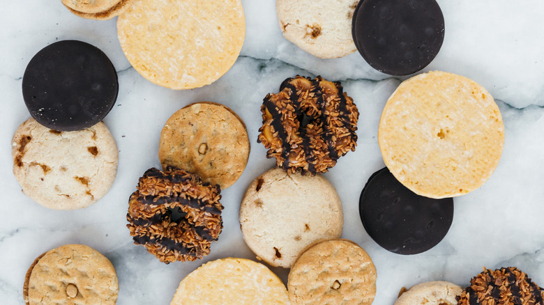 While the classic cookie salad recipe is already a crowd-pleaser, there are endless ways to customize it to make it your own and elevate it to the next level of sweetness. The star ingredient that goes into a truly great cookie salad is, of course, the cookies themselves. If you're not a fan of Fudge Stripe cookies, then you'll want to substitute them with a selection of cookies that are both crispy and chewy. Try using chocolate chip cookies or Oreos for a more indulgent dessert, or swap them for copycat Samoa cookies.
