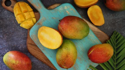 But remember — only refrigerate mangoes when they're ripe. Common characteristics of a ripe mango include color changes, where the fruit moves from green to red or orange; a bit of give in the flesh when the mango is pressed; and a sweet scent.