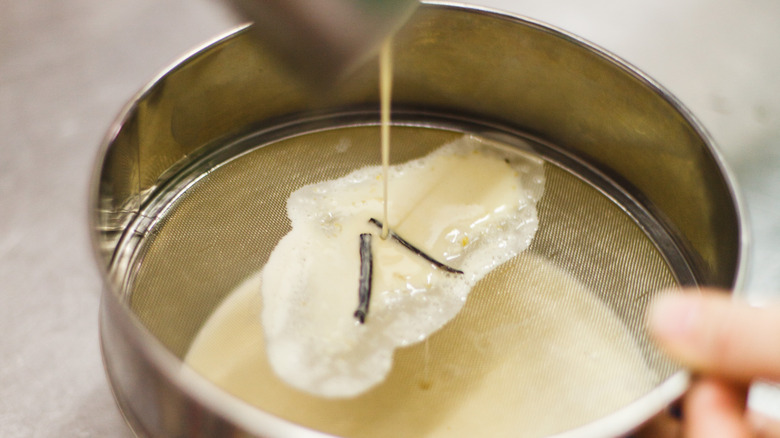 Usually, you can run the liquid through the strainer directly after you remove it from the heat. However, in certain instances, you can wait to strain it, like if you want to leave whole vanilla pods in the base overnight so their flavor really shines. Then again, you might not want to keep soggy basil or mint leaves in the liquid for too long, so it's all up to your judgment.