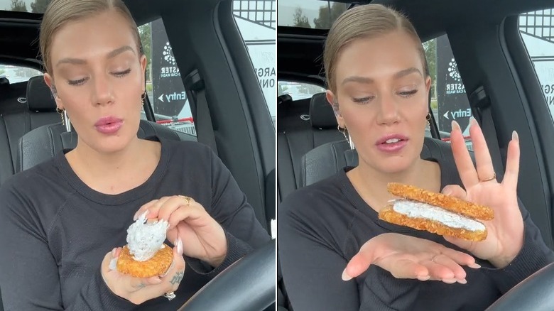 In one video, a content creator is shown spreading the Oreo-flavored McFlurry over a crispy hash brown (with that weirdly-shaped spoon) before placing a second hash brown on top. They press the "sandwich" together, and then take a bite, praising the flavor of the combination and calling it a "10 out of 10."