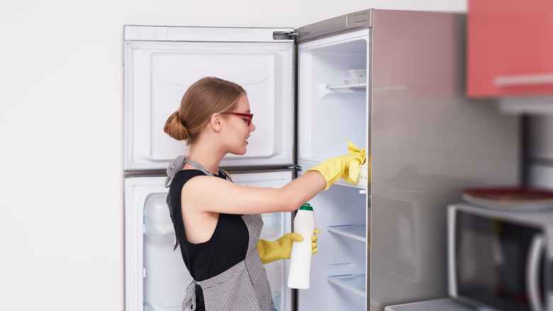 If you have an enormous amount of ice build-up, such as in a basement freezer you don't use as often, you may want to let it defrost first to help the ice melt faster. If you don't have too much ice, a quick scrub with hot water, detergent or soap, and cleaning solution will do the job just fine