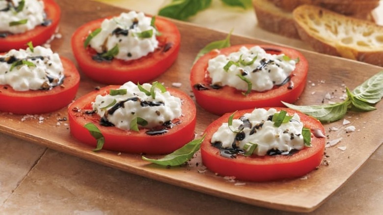 If you've been on TikTok recently, you might've been surprised to see a bunch of cottage cheese videos. This is because cottage cheese may be making a comeback due to its high protein value and dearth of calories. According to USA Today, the newfound popularity of cottage cheese was kicked off by an influencer who attributed her weight loss to a mustard and cottage cheese diet. While eating mustard and cottage cheese every day is certainly one way to do it, an easy way to lower your calorie intake is to replace high-fat cheeses with cottage cheese. One way to do this is by making a delicious cottage cheese Caprese salad.