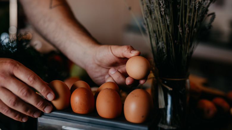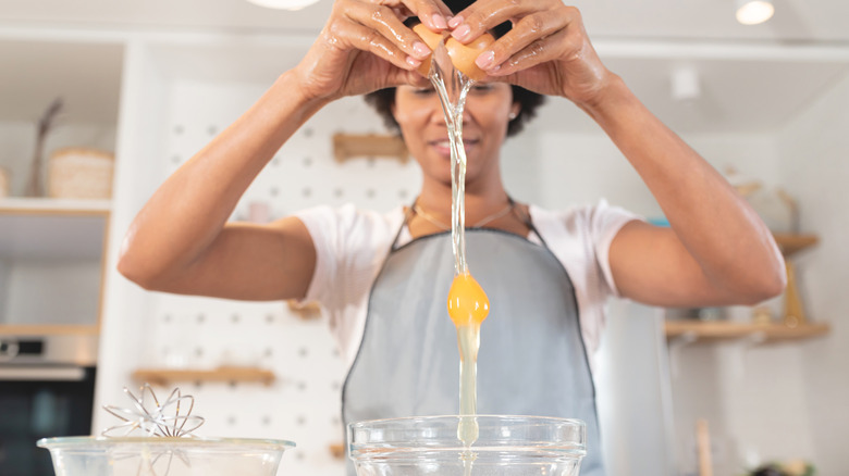 Whenever you've handled eggs, such as when cracking them into cake batter, make sure that you wash your hands before touching the egg carton or other cooking utensils to prevent the spread of germs in your kitchen. Get into the habit of disposing of eggshells immediately after cracking eggs — it's a good idea to make this convenient by storing your compost bin within close proximity to the kitchen counter where you're working. Keep your egg cartons clean and free of eggshells. No one wants bacteria as a side dish to their breakfast eggs!