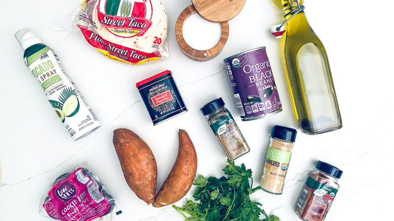 Collect the ingredients for these beet and sweet potato taquitos