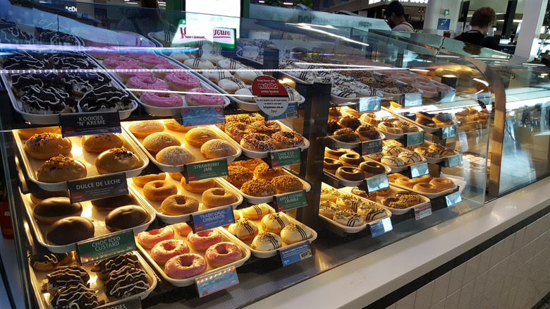 As usual, the chain always offers its original glazed donut. Chocolate lovers might prefer to indulge in a chocolate iced glazed or the chocolate iced with sprinkles. If you're seeking something more decadent, the chain offers a wide variety of filled donuts, including raspberry, lemon, cake batter, kreme, and custard. Other offerings include the classic strawberry iced donut with sprinkles and a glazed blueberry cake donut.