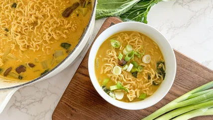 While many people rely on savory meat to boost flavor in their meals, Carli says, "When I develop vegetarian or vegan recipes, I rely on other flavor-makers to pack a punch." Carli is referring to her use of umami-forward mushrooms, aromatics like garlic and ginger, as well as curry powder, full-fat coconut milk, and red curry paste. Add in some classic ramen noodles and you have your new favorite veggie-forward dish.