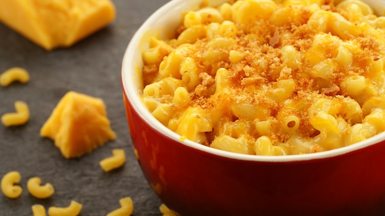 Even if Americans weren't eating the store-bought stuff, macaroni noodles with cheese sauce quickly became a much-loved staple, with homes developing their own recipes for decades afterward. Common adaptations of this beloved dish include adding bread crumbs for crispiness, buffalo sauce or peppers for spice, or vegetables like broccoli or spinach for a slightly healthier take on the classic.