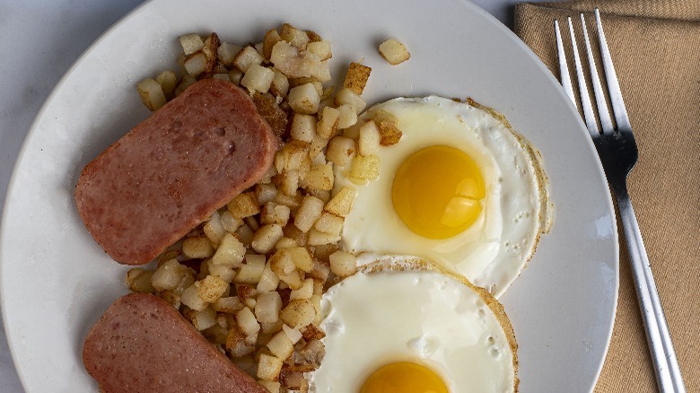 You don't have to be a master chef to cook this dish for yourself — simply fry a couple of slices of spam in a pan with a few eggs. It is also a highly customizable dish and can be served with other foods, like potatoes, tomatoes, spinach, and rice.