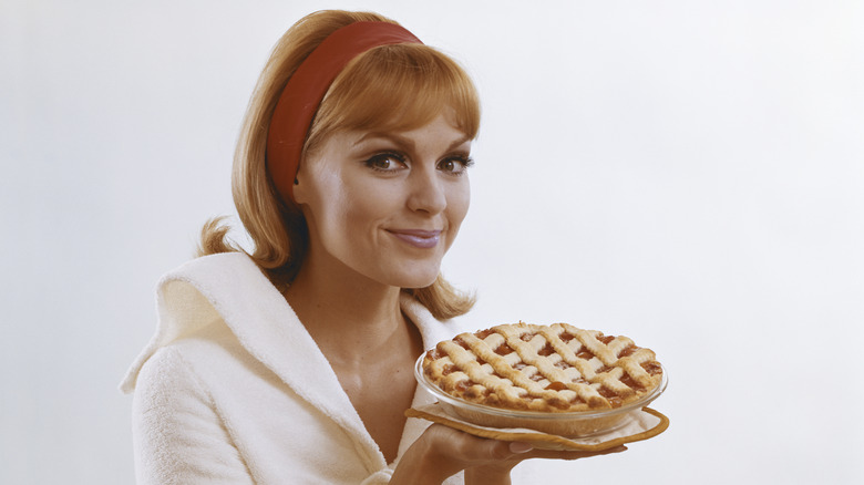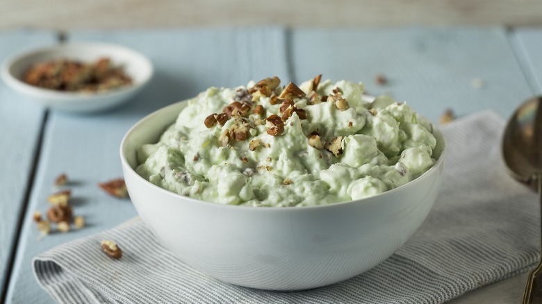 Made with Jell-o's newly-released instant pistachio pudding mix, pineapples, whipped cream, and a whole lot of nuts, this fluffy dessert is made in a similar way to ambrosia salad, which was a popular dessert in the '50s and '60s. It was often topped with walnuts or maraschino cherries.