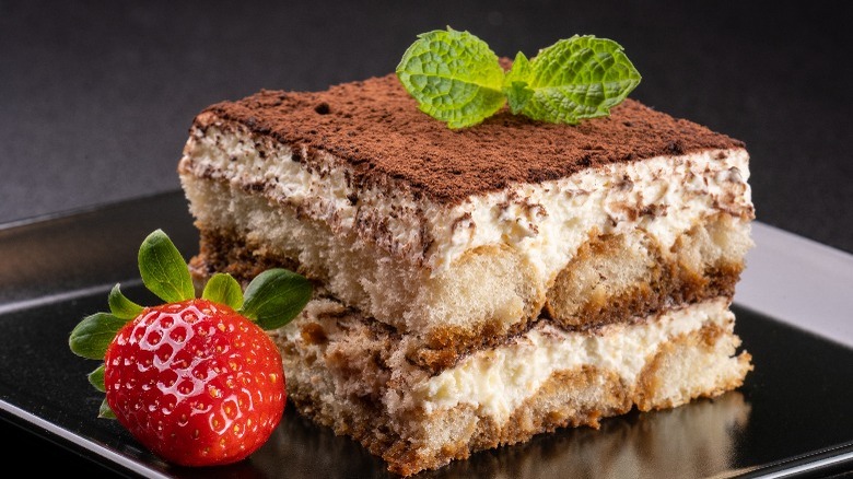 Tiramisu features espresso-soaked ladyfingers, creamy mascarpone cheese, and a dusting of cocoa, which create a delicate balance of flavors and textures. It's sometimes served with mint, strawberries, or raspberries to balance out the sweet chocolate flavor.