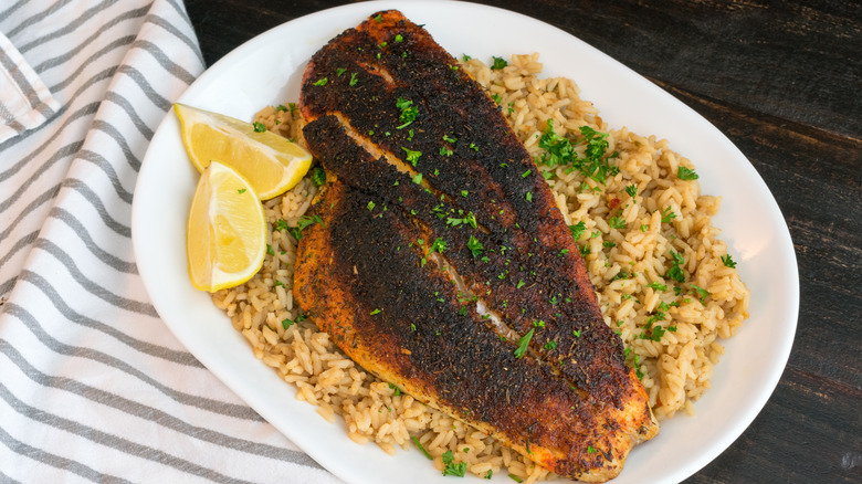The process involves dipping the fish in butter before being coated with a blend of herbs and spices. The fish is then placed in a very hot cast iron skillet to char the butter and spices to a dark brownish-black color and a rich, slightly spicy flavor. Blackened redfish is often served on a bed of rice.