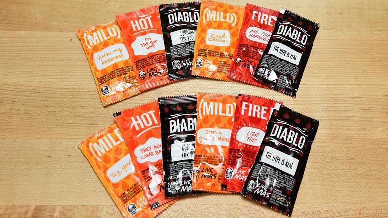 If you've dined at a Taco Bell, you've likely tried the fast-food chain's sauce packets at some point. Taco Bell offers its sauce in four degrees of spiciness: mild, hot, fire, and diablo (which is one of the spiciest fast-food sauces available). Or, if you grab something off the Taco Bell breakfast menu, you could grab a packet of breakfast salsa.
