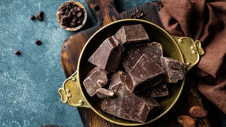 Due to this simple, yet satisfyingly refreshing recipe, when making handmade chocolate-covered strawberries, it's key to choose a dipping chocolate that's not overly sweet. Specifically, a semi-sweet or bittersweet baking chocolate is best for the task. Since baking chocolates are intended to be used in culinary methods where the baker will customize and add their own sweeteners and flavors to the mix, they typically contain higher levels of cacao — and less sugar, other emulsifiers, and flavorings — compared to your standard bag of Nestlé chocolate chips.