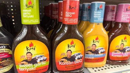 In a July 19 Instagram post, Roy Choi, chef-owner of Los Angeles-based Korean BBQ taco truck, Kogi BBQ, shared with his followers "the new drop" of a 32-ounce Kogi Sweet Garlic Teriyaki Sauce at Costco. In his post, he featured a picture of the bottles lined up on retail shelves of the bulk retailer alongside other kitchen condiment staples, including Cholula and Tabasco.