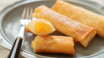 To make these treats, follow much the same procedure as you would with egg rolls. Simply place some of the apple pie filling on the wrapper, roll it up, and bake or fry it until the rolls are crispy and golden brown.