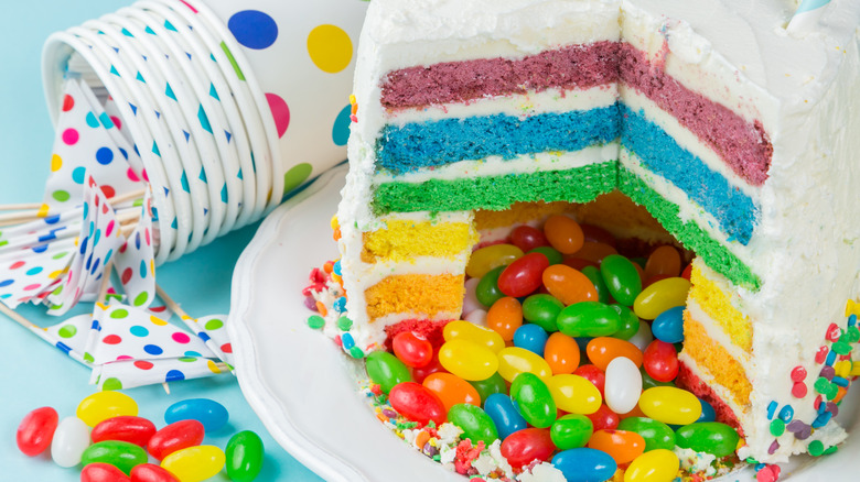 Once you've got your flavor profile down, think about how you want your cake to look. If you're interested in a rainbow-colored cake, choose candy that comes in rainbow colors, like Skittles or M&Ms. If you need to stick to a specific theme, such as a beach birthday party, look for candy that matches the theme. Gummy sharks, Life Savers (they're life rafts!), and crushed vanilla wafer cookies (that will resemble sand), are all great options in this case.