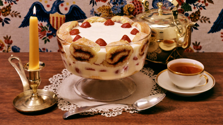 The trifle continued to gain popularity in the 19th century, and was a favorite of waste-not-want-not Victorian cuisine. Though the trifle was just as often made from scratch, many Victorian-era trifles were simply the ingenuitive result of ensuring all leftovers were used up. Stale cake was soaked in sherry or wine and layered with leftover custards, the whole thing topped with any extra whipped cream that would otherwise go to waste without refrigeration.