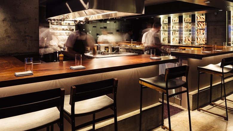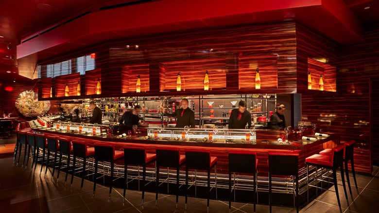 A sleek counter, bathed in the dimly-lit red lights, sets the stage for an intimate affair. Comfortable leather-clad stools pull you closer to the action as polished countertops become the canvas for a world of tempting flavors. Chefs, like skilled artists, chop, season, and sear the food, and you can follow their precise movements throughout the evening service.