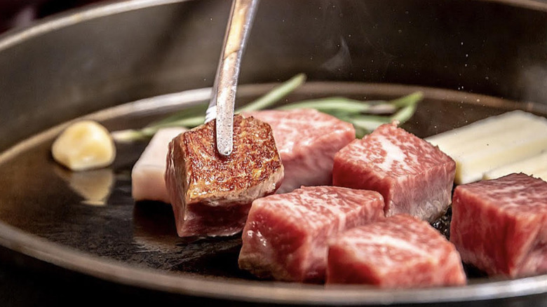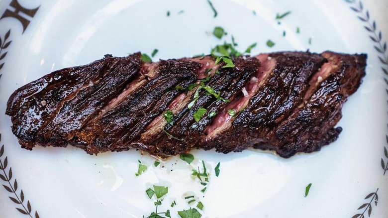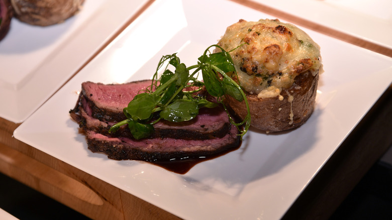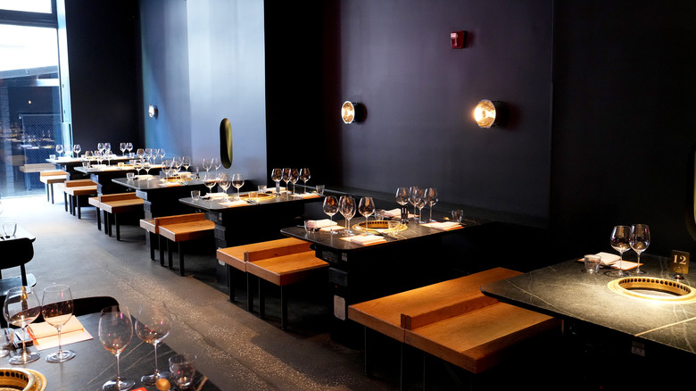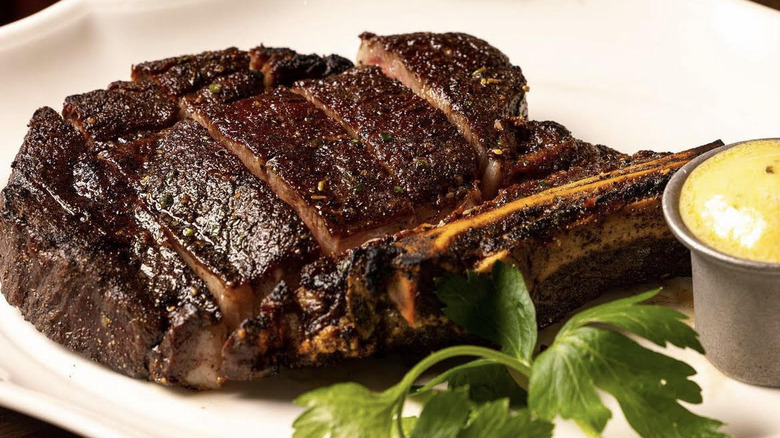 One intriguing aspect of the STK menu is how the steaks are separated into three categories — small, medium, and large. The small steaks are the filet, skirt, and ribeye which are 6, 8, and 8 ounces, respectively, and are on the low end of the cost scale. The medium steaks also include three filets, featuring an NY strip, a dry-aged Delmonico, and more. The steaks in the largest category are the standard Porterhouse and Tomahawk. There's also a Wagyu selection with the Australian Flat Iron, Japanese A5 Strip, and the Japanese A5 Filet. And if you're all about steak sauces, STK offers eight different options to add to your meal.