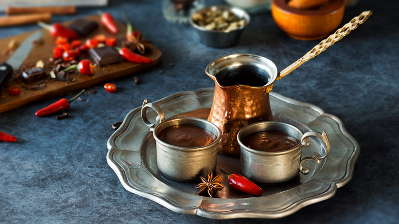 We love chocolate because of its delicious and decadently sweet flavor, but the ancient brew of the Aztecs and Mayans — which was greasy, gritty, and bitter — is a far cry from the silky smooth hot chocolate we're used to now. Mesoamerican people enhanced their chocolate with a variety of spices to cut through the bitter flavor, but since they didn't have access to refined sugar, there wasn't much they could do to sweeten it. The chocolate was enjoyed with honey, vanilla, cinnamon, anise, chili peppers, or rosewater and generally took on a deep red or orange color because of these spicy additions. It could also be mixed with masa, a dough made of ground corn.