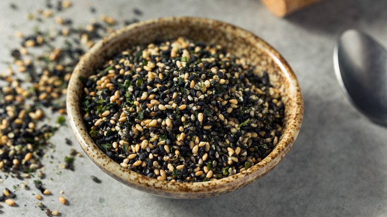The Japanese spice blend furikake is commonly used to season rice, but it's just as delicious on noodles. As with many spice mixes, there are many variations of furikake. But most recipes for this seasoning blend include sesame seeds, sugar, salt, and one fishy ingredient — usually bonito flakes or dried seaweed. You can also find versions of furikake made with wasabi or green tea.