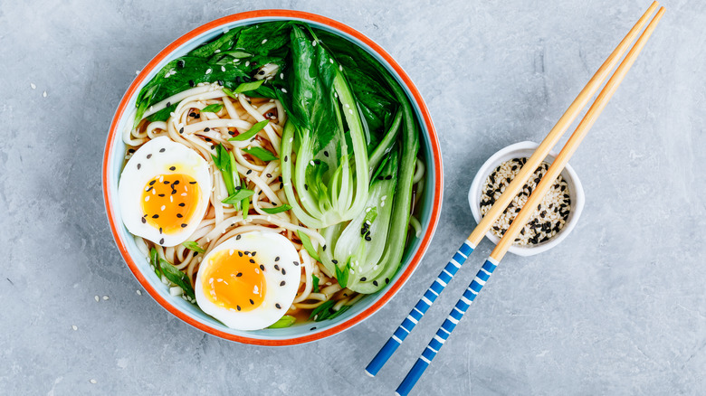Bok choy is a fantastic choice, as this leafy green vegetable is well-suited for soups and stews. It's a good source of selenium, a mineral that helps thyroid function and the immune system. Kale is another solid option. It's rich in a slew of vitamins and nutrients like beta-carotene. Folate-packed spinach is another superfood that's easy to stir into ramen. It also gives it an earthy, vegetal flavor, along with its health benefits. Arugula, watercress, and Swiss chard are other good greens to consider, as well.