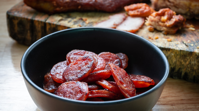 Adding chopped or sliced pieces of sausage to ramen instantly amplifies the meatiness factor. Look for sausages that are ready to eat — usually, they'll be labeled as dried or fully cooked — and all you have to do is add them to the simmering ramen to heat them up. There's no raw meat in these types of sausage, so you don't need to worry about cooking them to a safe temperature. Some sausages that may fall into this category are Chinese-style sausage, pepperoni, and salami. If you want to add an extra step, you can fry them beforehand in a pan to render out some fat and give them browned, crispy edges for more flavor.