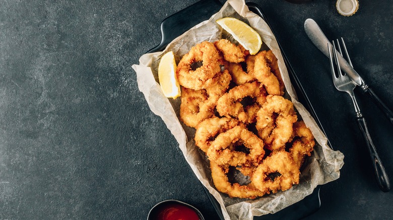 For those who aren't enormous fans of fishier tastes, fried calamari is an excellent choice at a seafood restaurant. The dish is made by taking sliced squid rings, battering them, and deep-frying them, resulting in a crispy finger food with a mild flavor. But while fried calamari might be a safe choice flavor-wise, health-wise, it's another matter due to its cooking process.