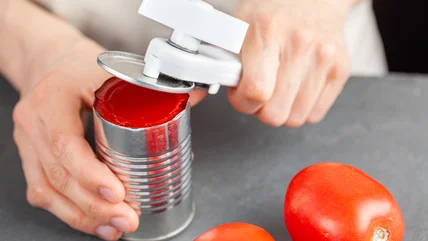 Removing the tomato paste from a can doesn't have to be difficult, nor does it need to result in some of it being stuck in the can and wasted. On TikTok, user Laura Hickmon demonstrates this hack for cleanly getting it out. First, open one side of the can as normal, removing the metal top. Then, flip the can over and open the other side, leaving the metal piece in the opening after it is fully detached. Once both ends are unsealed, remove one of the lids from either side and simply push the metal lid you left on through. This will cause the tomato paste to slide out. If need be, use the end of a utensil to make pushing it through easier. Once the tomato paste is out of the can, don't forget to remove the other metal end.