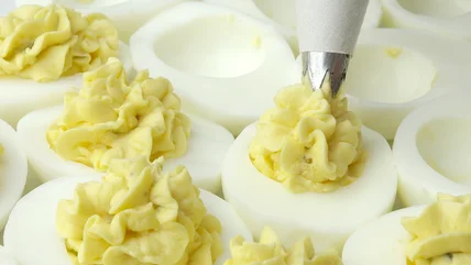 If you've never made deviled eggs before, the basic procedure of any recipe is to cut boiled eggs in half lengthwise, scoop out the yolks, mix them with flavoring ingredients, and then scoop them back into the egg whites. From there, the sky's the limit when it comes to what you can add to make unique deviled eggs — everything from bacon, pickle juice, and sriracha, to avocado, and more. Pretty much anything pickled tastes good with salty, fatty mayonnaise, so cocktail garnishes like olives and onions are fair game.