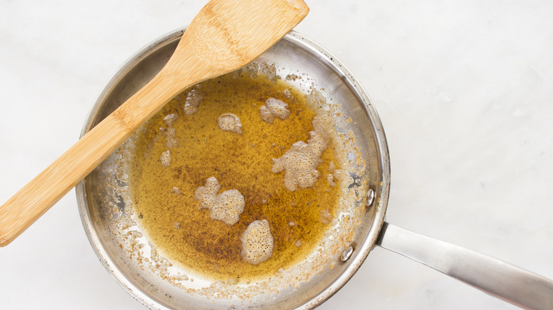 To make a batch of brown butter, all you need is some unsalted butter and a heavy-bottomed pot or pan. It helps to choose a light-colored pan so that you can see when the butter solids turn brown (so avoid using nonstick pans that have black or dark gray interiors). Cut your butter into equal-sized chunks and put them in a pot over medium heat. Let the butter melt and start to bubble. Once the butter fat and solids separate, the butter will begin to turn brown, which should start happening around six to eight minutes into the process. Stir or whirl the pan around to let the butter cook evenly until it turns a deep brown and before it turns black (which means it's gone too far). Once you can tell that your brown butter is ready, take it off the heat and pour it into a heat-safe container to keep it from continuing to cook. Once your butter is cooled to room temperature, you can measure it and add it to your boxed cake.