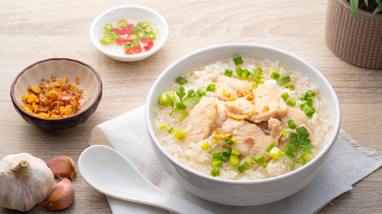 In Indonesia, a rice porridge called bubur ayam is a classic breakfast. Made with chicken broth, it's usually enjoyed with a variety of sides like fried peanuts, chopped shallots, sambal (a spicy chili sauce), and a kind of Chinese-style fried bread called cakwe, thinly sliced.