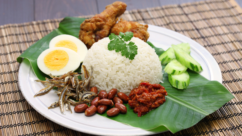 Nasi lemak is usually served together with a handful of other things, including fried peanuts, crispy fried anchovies, fried chicken, sliced cucumber, and boiled eggs. The most essential part of the dish though, holding everything together, is a generous spoonful of sambal. This is a sweet and spicy chili sauce made with seafood and garlic.