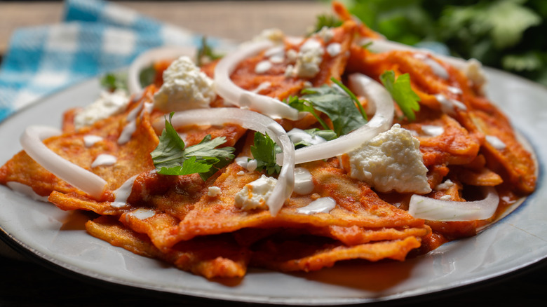 Many Mexican dishes involve tortillas, and this traditional breakfast is no different. Chilaquiles are made with crisp tortilla chips, best prepared fresh by slicing and frying corn tortillas.