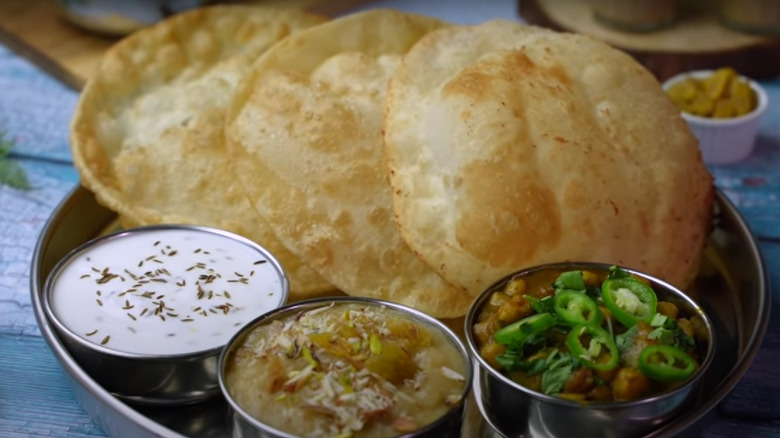 For a traditional breakfast (nashta) spread, the flatbread is deep fried, and two other dishes join the semolina pudding — a thick chickpea curry and a lightly spiced potato curry. The dishes are small, giving a nice balance of both flavor and nutrition without being too filling.
