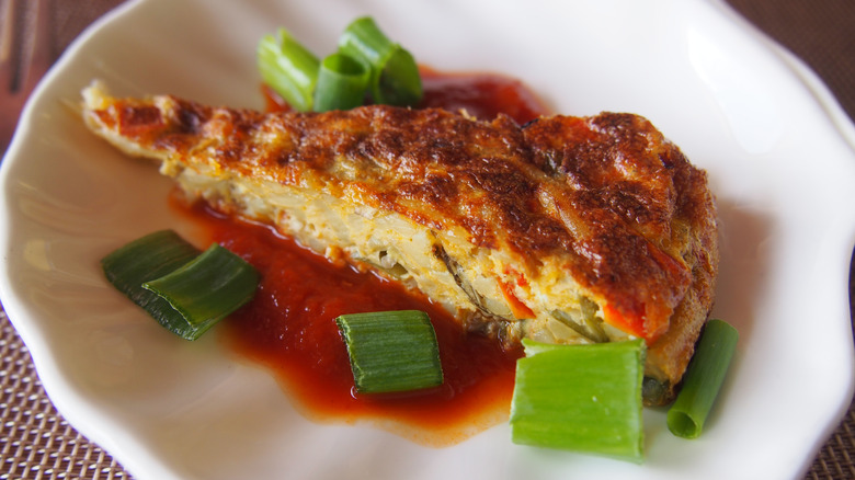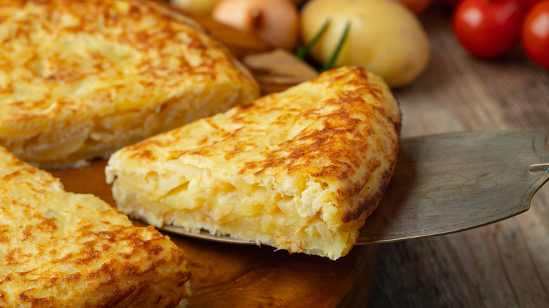 The trick to a good tortilla is to cook the potato slices first, so they're succulent and tender in the finished omelet. A hearty slice of this is a popular breakfast in Madrid and Northern Spain. It's often accompanied by black coffee, or sometimes a mid-morning beer.