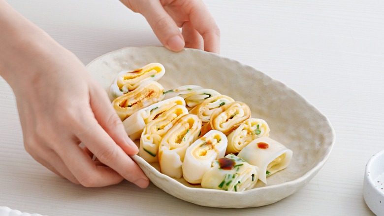 Dan bing are thin pancakes made from egg and flour, and the exact batter used varies from place to place. They're usually wrapped around things like ham or grated cheese and are often served with condiments like sweet soy sauce, chili sauce, or Japanese mayonnaise.