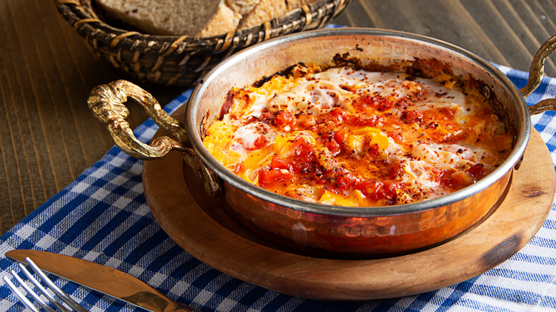 Quite similar to a North African breakfast dish, shakshuka, menemen is a scrambled egg dish with the rich flavors of olive oil, tomato, and onion. The eggs are best lightly cooked, so they're still soft and juicy. The whole thing is often flavored with oregano and chili flakes, for added aroma.