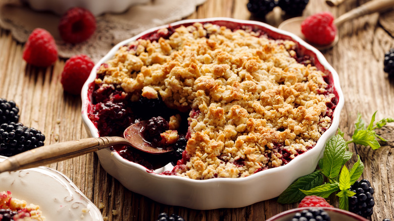 Unlike pies and other pastry-top dishes, the colder the temperature you store crumb toppings in, the more likely the crumbs are to deteriorate in texture. When you reheat your meal, you'll be left with a limp, soggy layer on top — that's the opposite of appetizing. These dishes should be stored in the refrigerator whenever possible to prevent loss of quality, or better yet, eaten fresh straight from the oven.