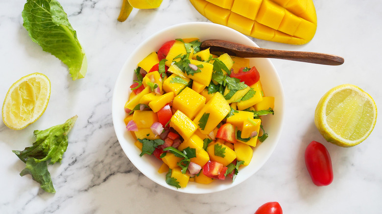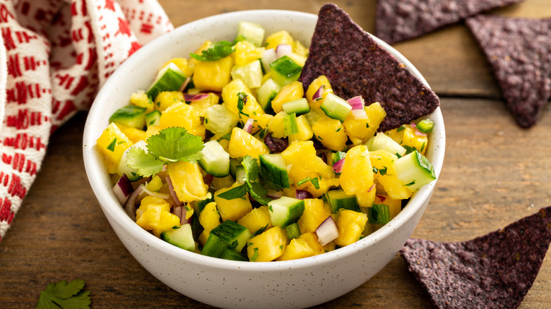 Fruit salsa is a sweet-heat salsa variety that strays from the typical acidic spiciness that comes with tomato salsa. The fruit adds a bright touch and perfectly balances jalapeños and onions. Plus, it feels so at home on a grilled hot dog; you won't need any other toppings.