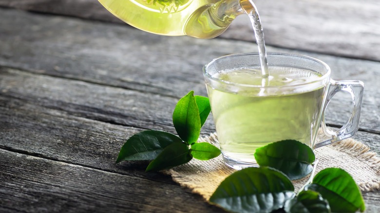 Green tea is made with leaves from the camellia sinensis plant, according to Medical News Today. These leaves are cooked to stop oxidation, resulting in them retaining their green color and grassy flavor. Popular types of green tea include matcha, hojicha, and jasmine.