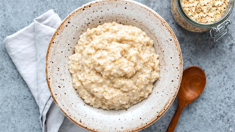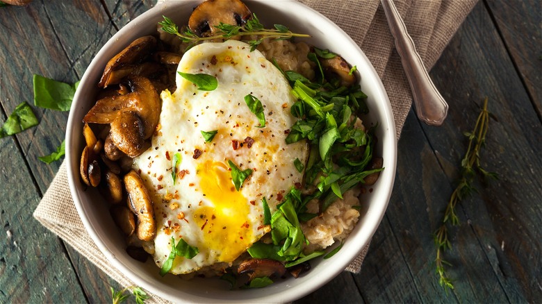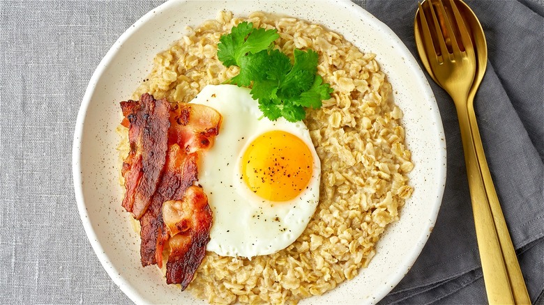 Many of us count on warm bowls of oatmeal to keep our stomachs full until lunchtime. When you're looking for quick and healthy breakfast ideas, depending on which variety you choose, oatmeal is not only convenient but also nutritious. Just one cup of cooked oatmeal contains a significant amount of protein, fiber, and essential vitamins including manganese and phosphorus. Yet, apart from the obvious health attributes, a lot of foodies categorize cooked oats as a sweeter breakfast choice. But there's no reason you can't adorn this nutritious meal with savory foods, including eggs.
