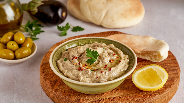 The dip is made from roasted, mashed eggplants, tahini, garlic, olive oil, and lemon juice. Regional variations may add cumin, parsley, or coriander. Baba ganoush is served as part of a mezze platter, which includes other dips and spreads with pita bread and vegetables. It has a smooth texture and savory, smoky taste.