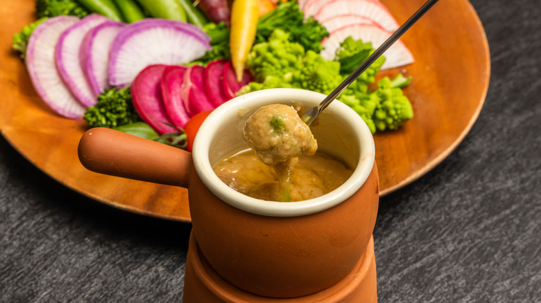 The savory dip is typically served hot, in a terracotta pot with a small flame, which helps keep the dip warm and melted. Raw or cooked vegetables are used as dipping vessels and thick pieces of bread are used as edible napkins to absorb anything that drips off the veggies. According to local Piedmont etiquette, bread should not be dipped in the oily dip, because it will soak up too much sauce. Diners should also avoid double-dipping.